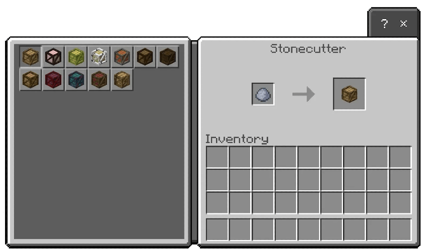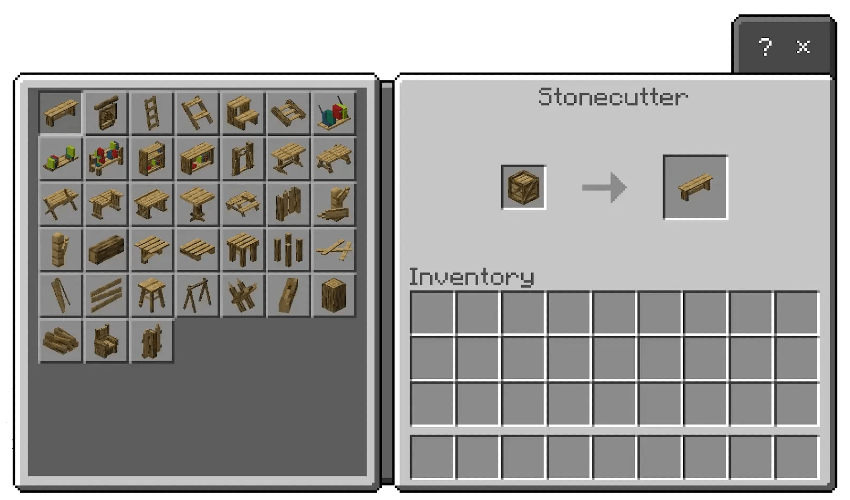 For Survival mode, crafting the furniture requires clay and a stonecutter. First, place clay into the stonecutter to unlock a menu of furniture category boxes classified by wood type. Select a box, return it to the stonecutter, and then choose from the available furniture options to begin decorating.