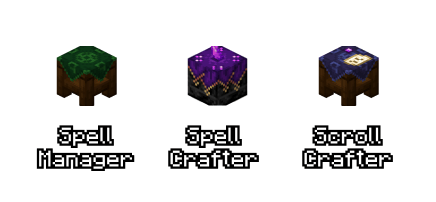 - Spellcrafter: Located in the Sparkling Tower structure, this block cannot be crafted normally and requires recharging using a Sparkling Crystal given to the Mage. It repairs scroll durability, transfers scroll spells into Spellbooks, empties Spellbooks, and enables spell leveling.