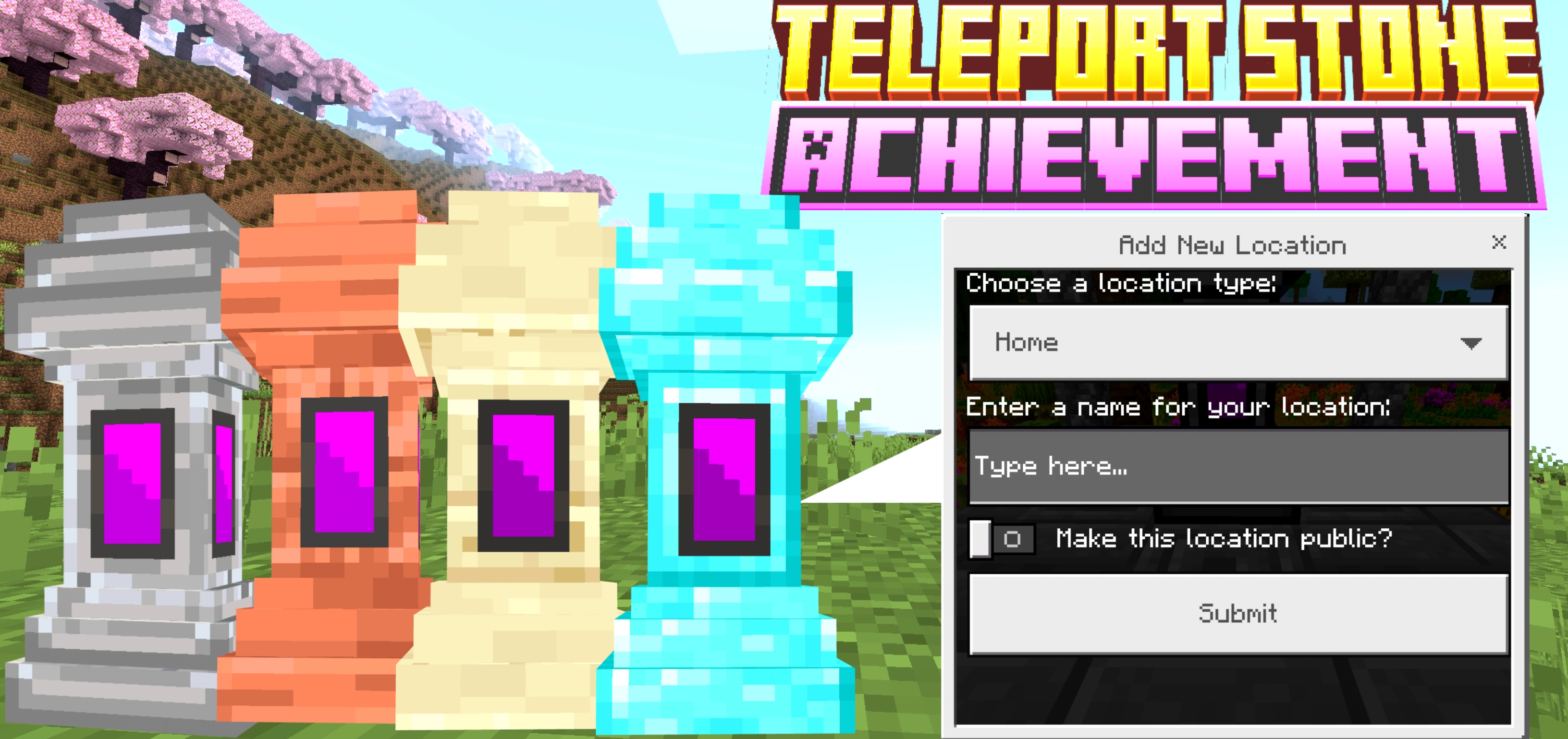 Teleport Stone [Achievement Friendly] enhances your Minecraft Bedrock experience by enabling the crafting and collection of Teleport Stones. These special stones allow players to set custom waypoints and instantly teleport across their world, simplifying exploration and travel.