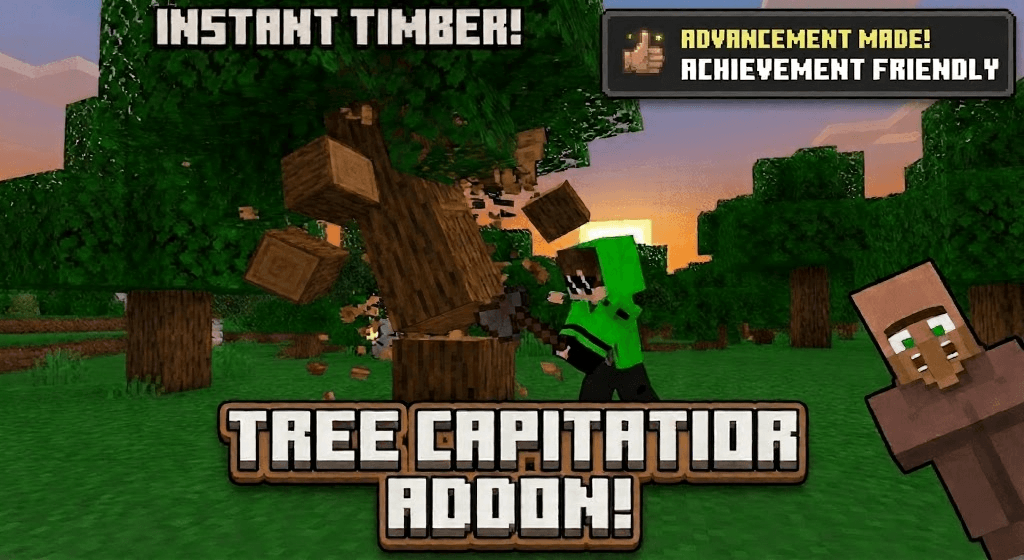 Tree Capitator is a Minecraft Bedrock addon designed to streamline tree chopping by allowing players to fell an entire tree by breaking just one log with an axe. This addon intelligently detects all connected logs of the same type and removes them gradually to prevent lag, making wood harvesting faster and more enjoyable while maintaining balanced survival gameplay.